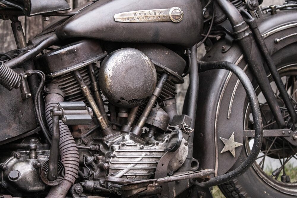 「この48年製ハーレーのパンヘッドは、アメリカの東海岸で発見されたもので、納屋の軒先に25年以上放置されていたそうです。オリジナルのペイントがなんだかわからないくらいエイジングしていますが、鉄は腐っておらず、湿度の低いエリアだからこその偶然の産物。これを見た瞬間に自分と重ね合わせてしまって(笑)。