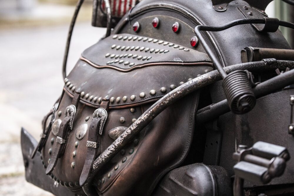 バッグはオリジナルが付いていましたが、さすがに使える状態ではなくてね。だから自分でまったく同じサイズで設計し、スタッズは本来付いていたものを移植しました。鉄と革は昔ながらの工業製品で使われている原始的な組み合わせ。ともにエイジングするので、その美しい調和には、本能的に惹かれます」