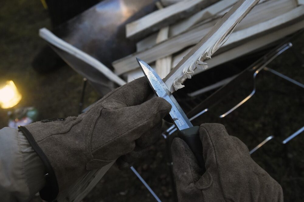 焚き火をする際に必要な薪は、焚き火台のサイズに合わせて調節。その際、ナイフ1本で薪を割るバトニングや細めの薪で焚き付けやすいようにするフェザースティックといったテクニックが必要となる。着火し、火が安定するまでの下準備は仲間同士で手分けすれば時間も短縮できる。