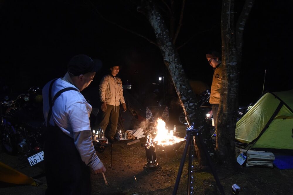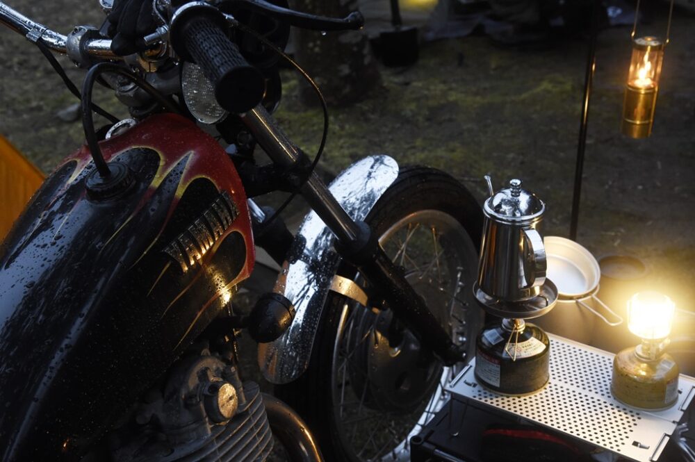 テント脇に並べた愛車がランタンの明かりのみで灯される光景を見られるのはバイクキャンプならでは。ただし強風時など火器の取り扱いには注意したい。