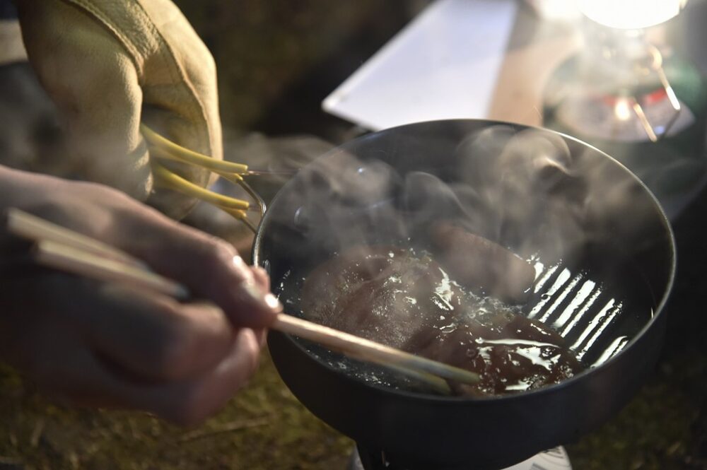 飯盒に入れた白米は焚き火台を跨ぐようにアイアンのトライポッドに吊るされ、直火で加熱。初めは中火、水分が吹き始めたら火力を強め一気に炊き上げる。