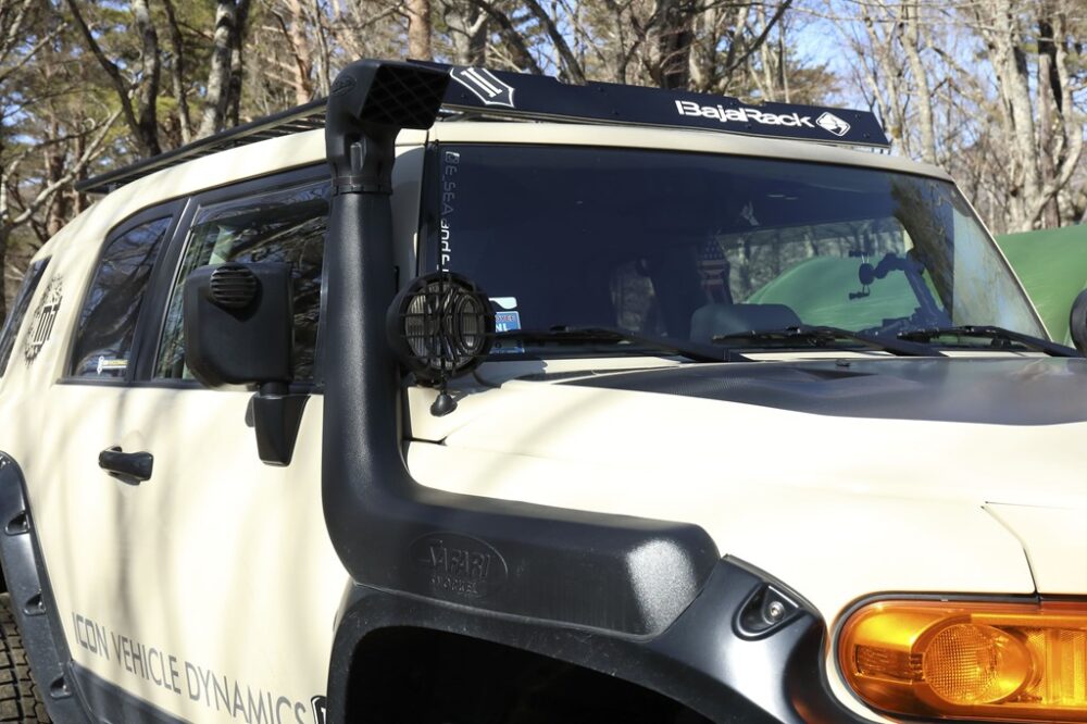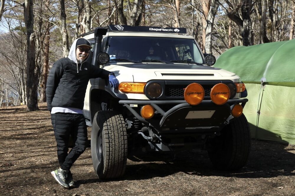 山崎さんと岡本さんは大のキャンプ好き。道具へのこだわりも強く、話題の高性能なものからクラシックな名作までひと通りそろっている。彼ら的にはFJクルーザーもキャンプに必要な道具のひとつ。左ハンドルの北米仕様の車両はもちろん、アメリカから直接取り寄せたFJクルーザー専用のカスタムパーツだったり、どこを切り取ってもキャンパー目線でのカスタムが施されている。