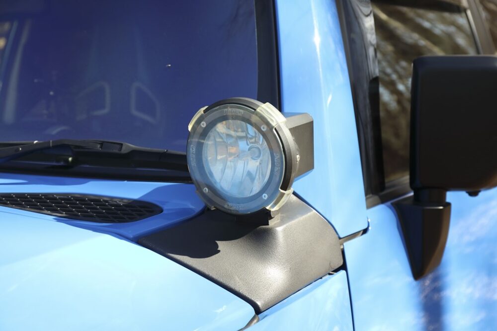 「ボディカラーと同じブルーのエンブレムが付けられたフロントグリルは、アメリカでしか販売されてないもの。インパクトがあるので気に入っています」