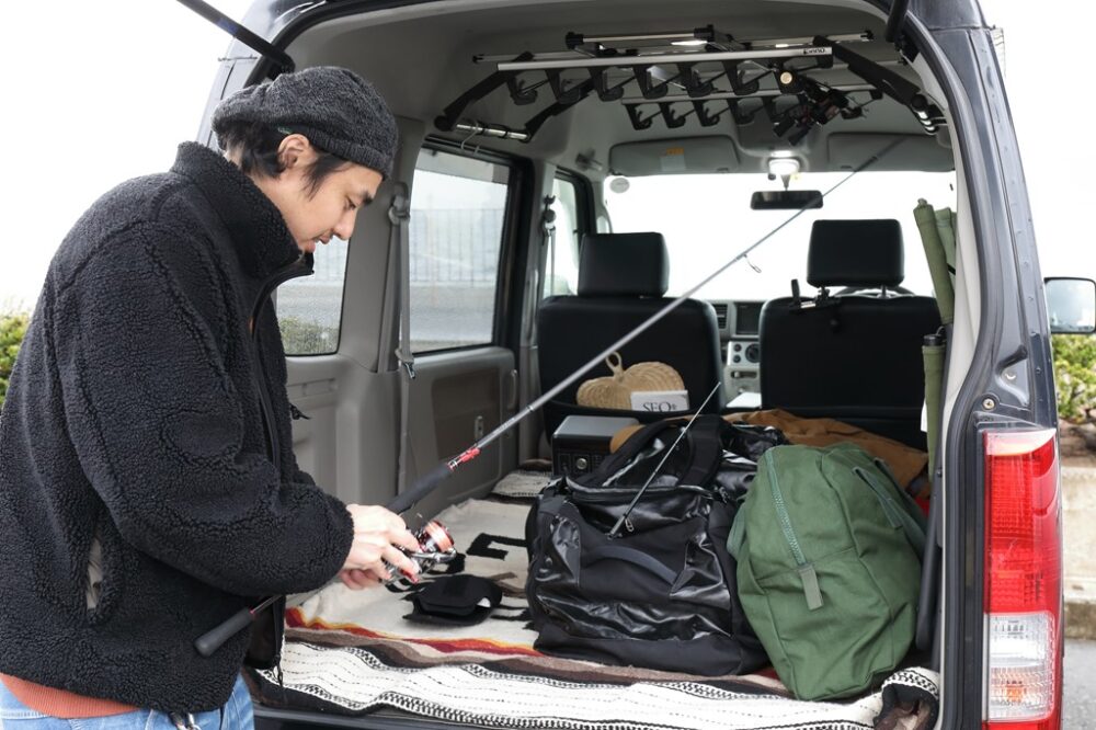 不要な道具はできるだけクルマで保管。釣り道具もキャンプ道具も必要最低限のものだけをフィールドへと持ち込むのが基本。