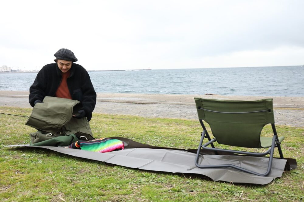 テントだけでなく、キャンプで必須のクッカーやチェア、コットなどのギア小物まで、すべてミリタリーギアぞろいの川島さん。実際に道具を試して、使いやすいものとそうでないものを精査するのも楽しいひととき。そんな彼が釣りキャンプに行くという。もちろんお気に入りのパップテントと一緒にだ。
