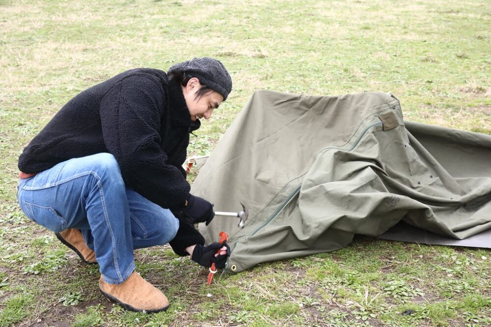 パップテントの利点は設営が簡単なところ。ペグを打ち込みしっかりトロープを固定し、あっという間に完成だ。