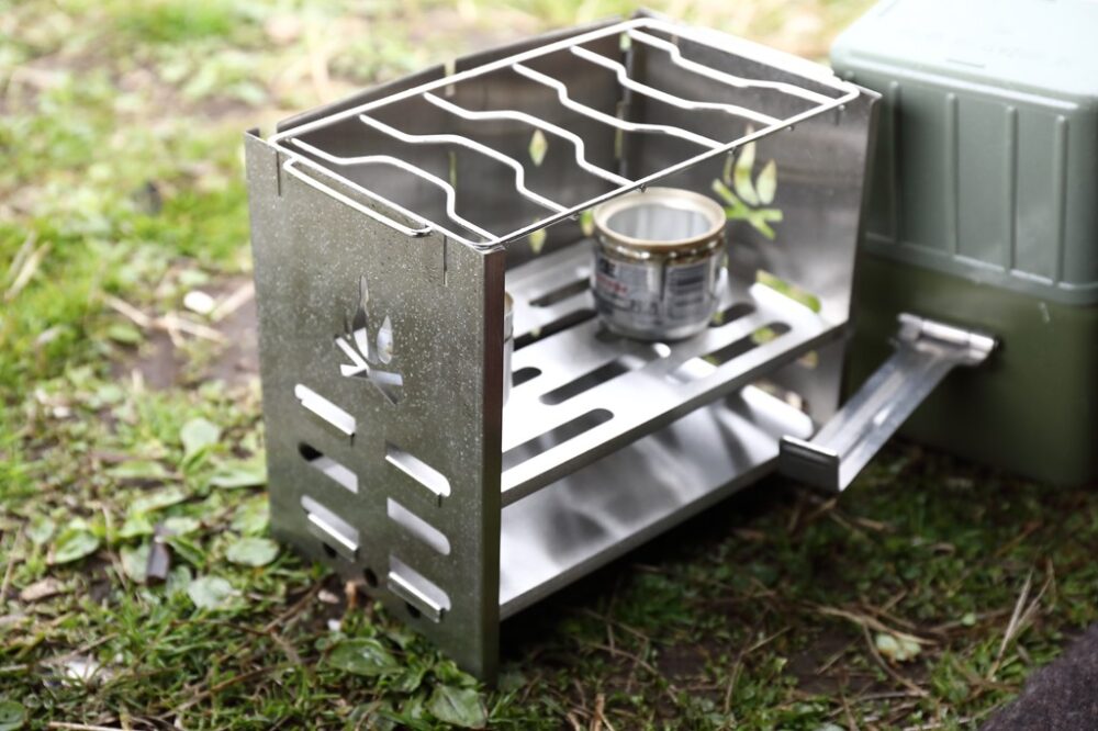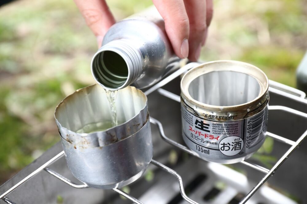 案外使える中華製の激安クッカー(写真上)も愛用している。自作アルコールストーブとアルコール入れは空き缶を再利用したもの(写真下)。