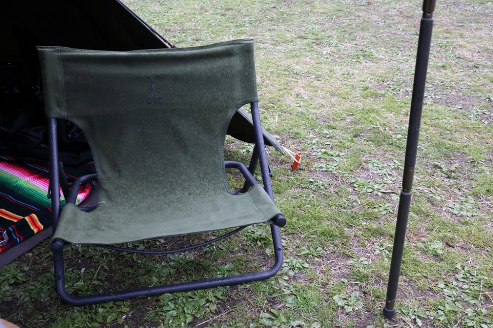 軽量ハイテクなテントよりも趣のあるミリタリー生まれのパップテントはヴィンテージもの。テント内で使用するコットやチェアもすべてミリタリーもので統一している。
