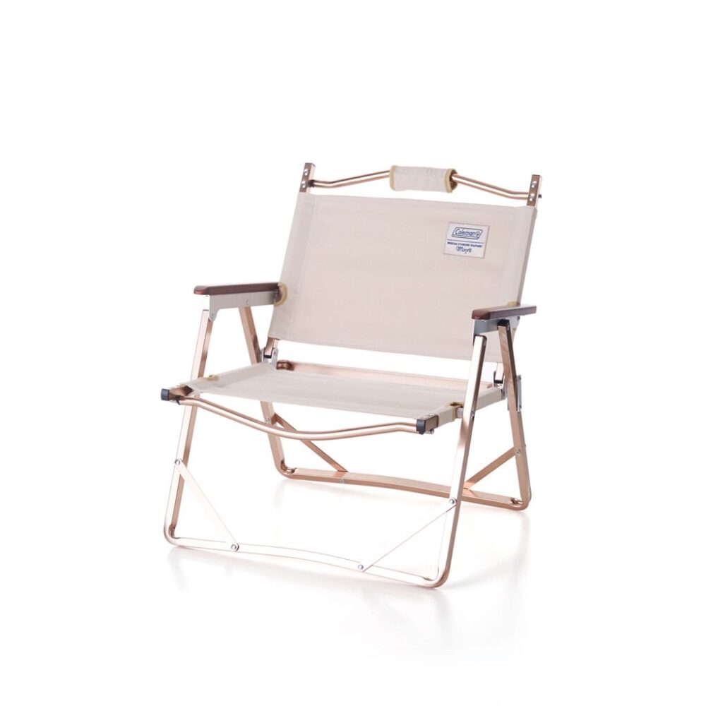 二人掛け用のロースタイルチェア。アームレスト部には高級感のある木製パーツを使用。ミリタリー調のカラーが男心をくすぐる。サイズ112×59×72cm(使用時)/1万6800円