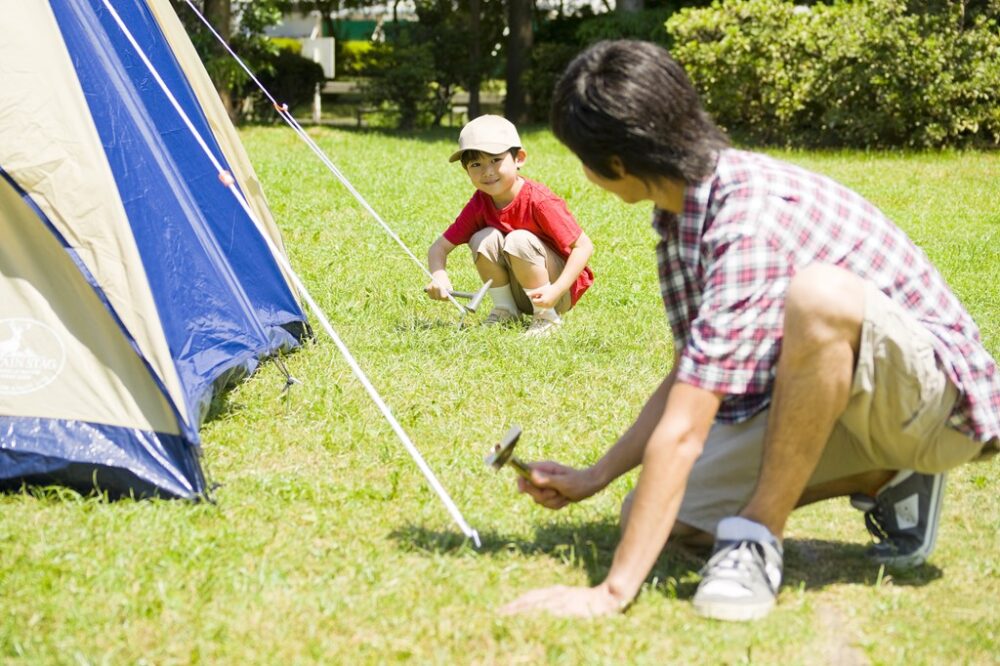 キャンプ場に何時にチェックインするかを基準に、出発時間を決めよう。キャンプ場に着く前に、食材・飲み物などの買い出しが必要な場合は、その時間も考慮する。到着したら、受付を済まして、タープやテントの設営だ。