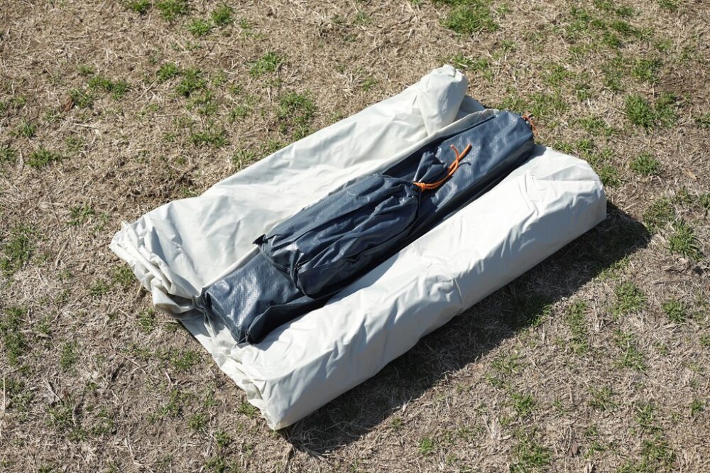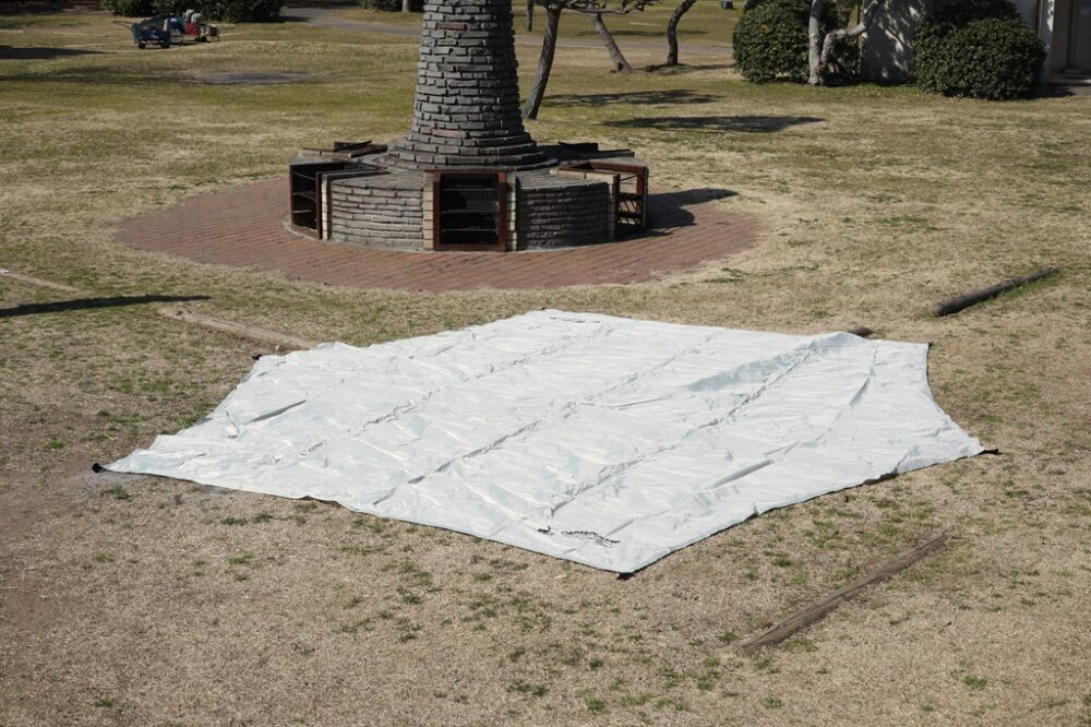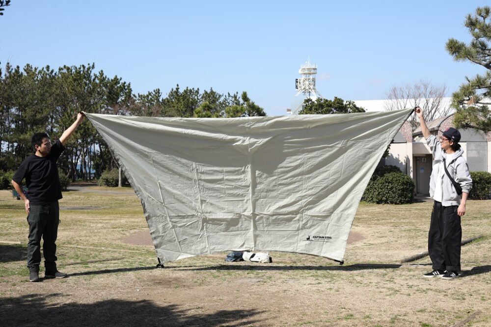 タープを張りたい場所に移動し、張りやすくなるように広げる。1人で作業できなくもないが、2人でやればなおスムーズに作業することができる。