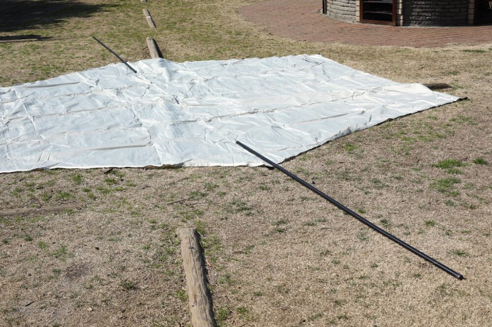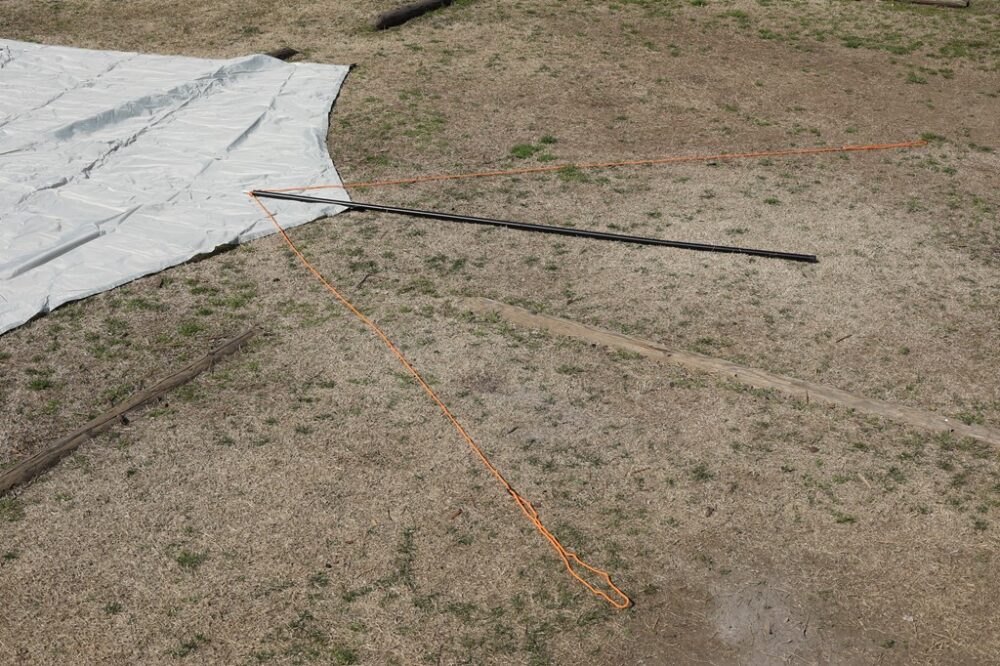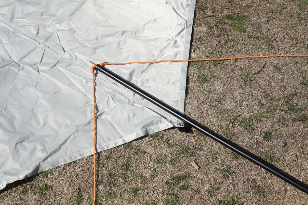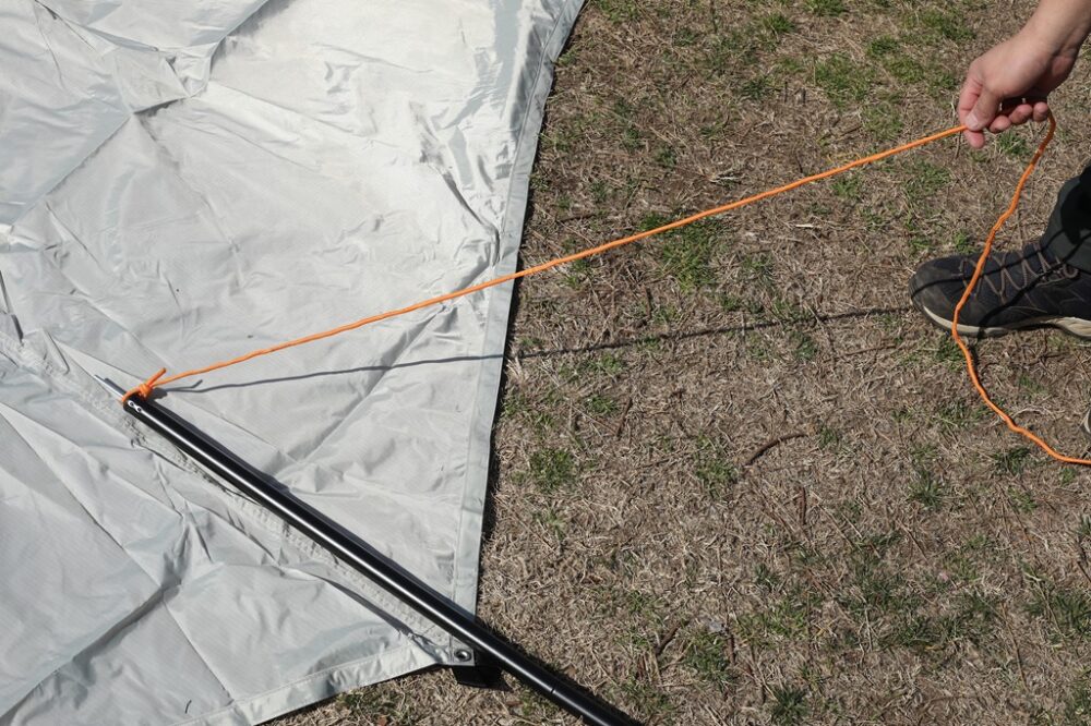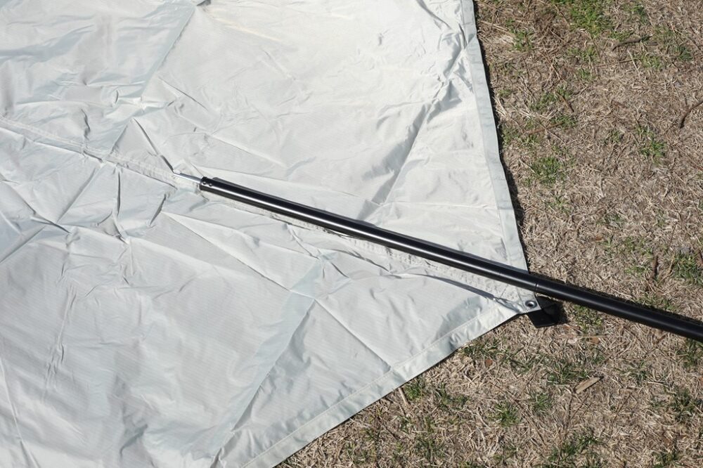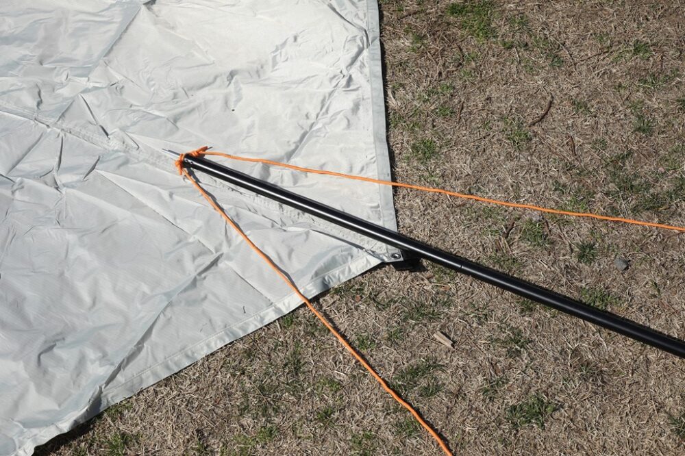 分割されているポールを組み立てたら、タープの差し込む穴のそばに置く。この時にタープの稜線の延長線上に置くようにすると作業がしやすい。