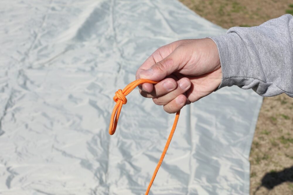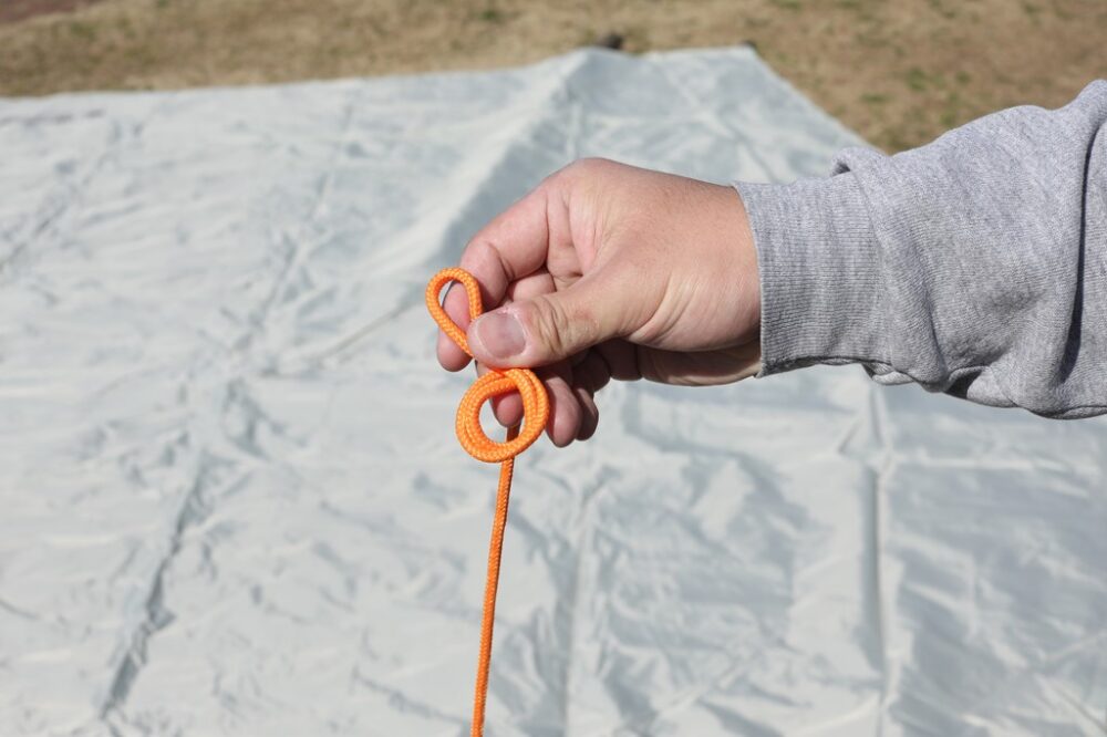 ガイライン(タープやテントを張るロープ)の先端に輪を作る。1本のポールにつき2つ必要なので計4つ。輪は引っかけるためのものなので、結び目は固く結ぶ。「2重8の字結び」を使うようにする。