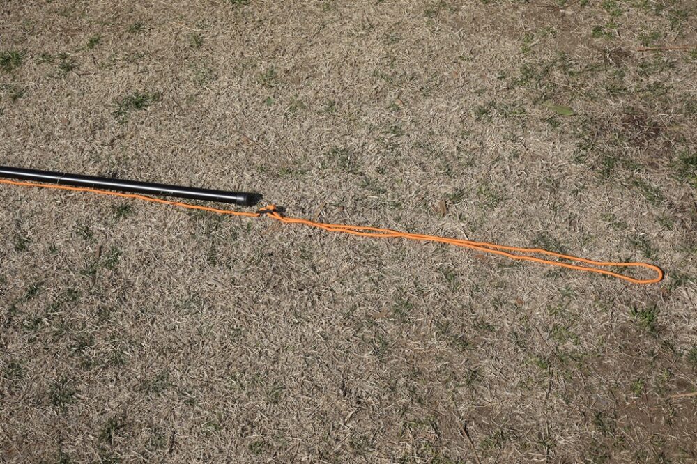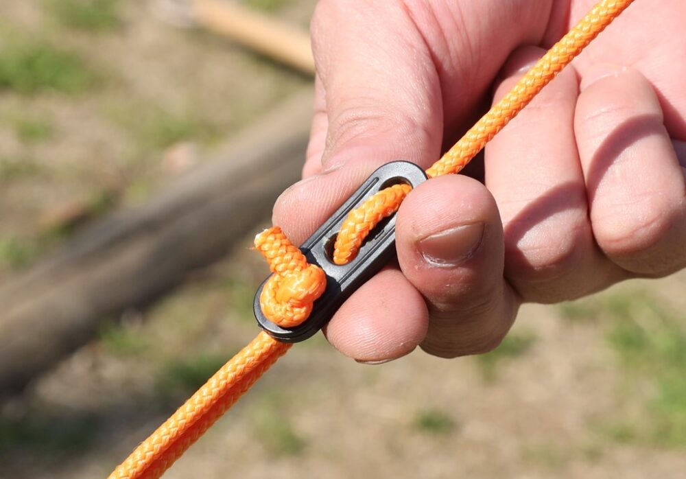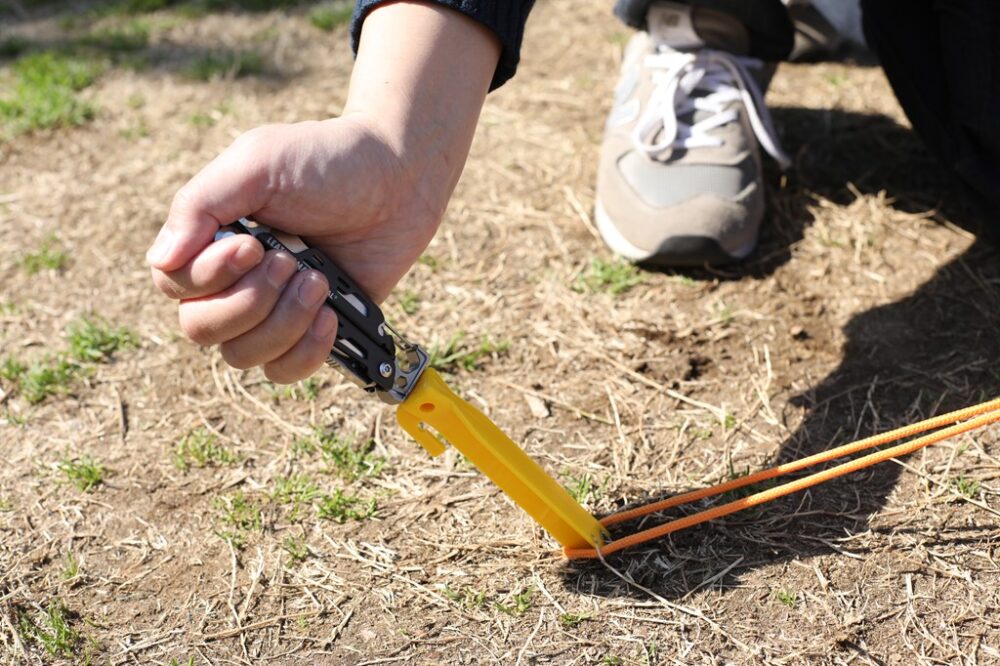 あらかじめガイラインの長さを調整しておくと、ポールを立てた際にスムーズに作業できる。ポールの長さ×0.5くらいが目安。