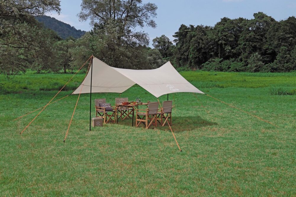 六角形の大きな布を山折りにして2点をポールで支える構造。設営も簡単なうえ、比較的軽量なので持ち運びに便利。初心者にも扱いやすいタープといえるだろう。