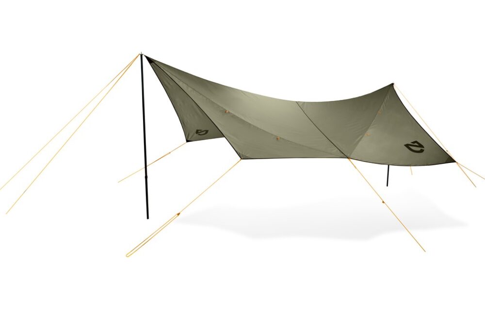 コンパクトなテントと相性のよい、2~4人で 使えるミドルサイズのタープ。生地にテンションがかけやすいように7ポイントを採用し、強風下でも安定した設置が可能。また天候に応じたアレンジもしやすい。フロア面積/10m2 収納サイズ/51×15cm 最小重量/1.47kg(モチヅキ TEL0256-32-0860)
