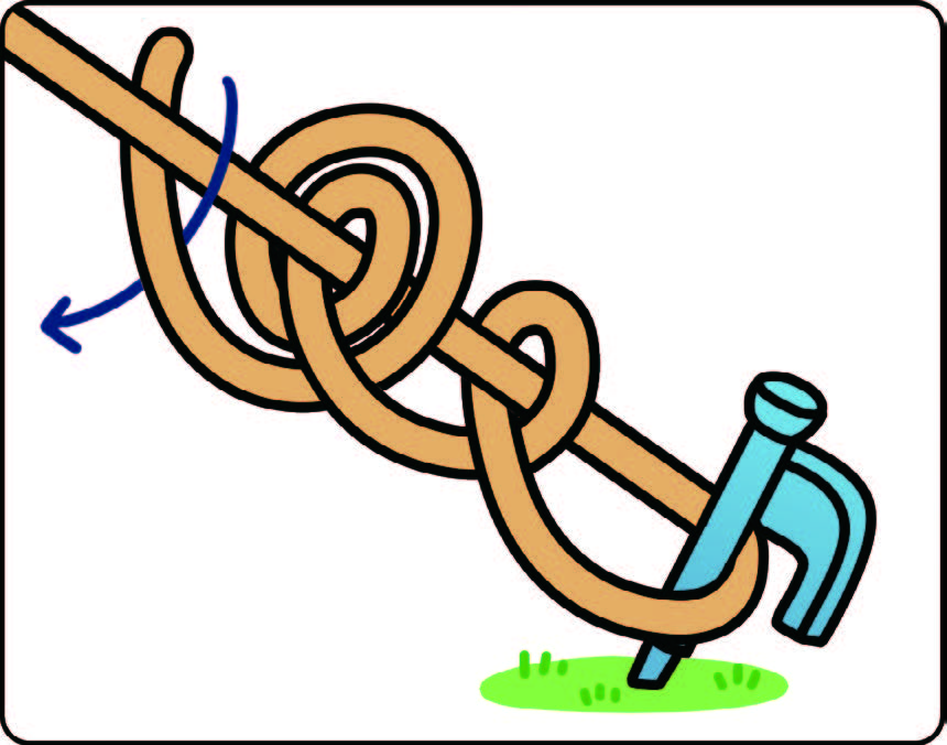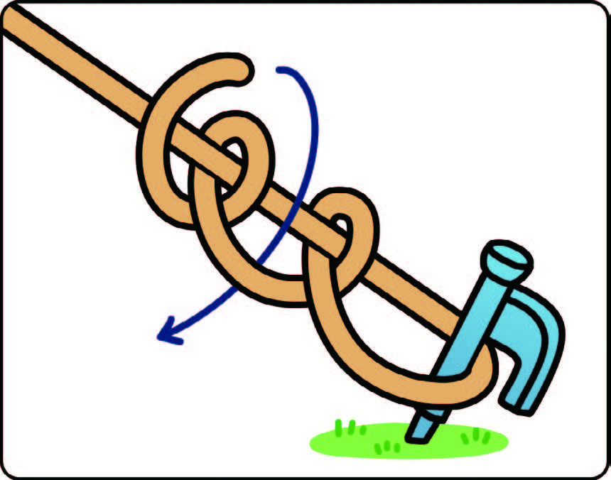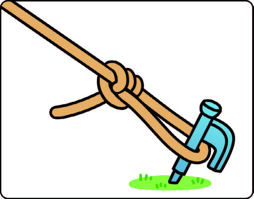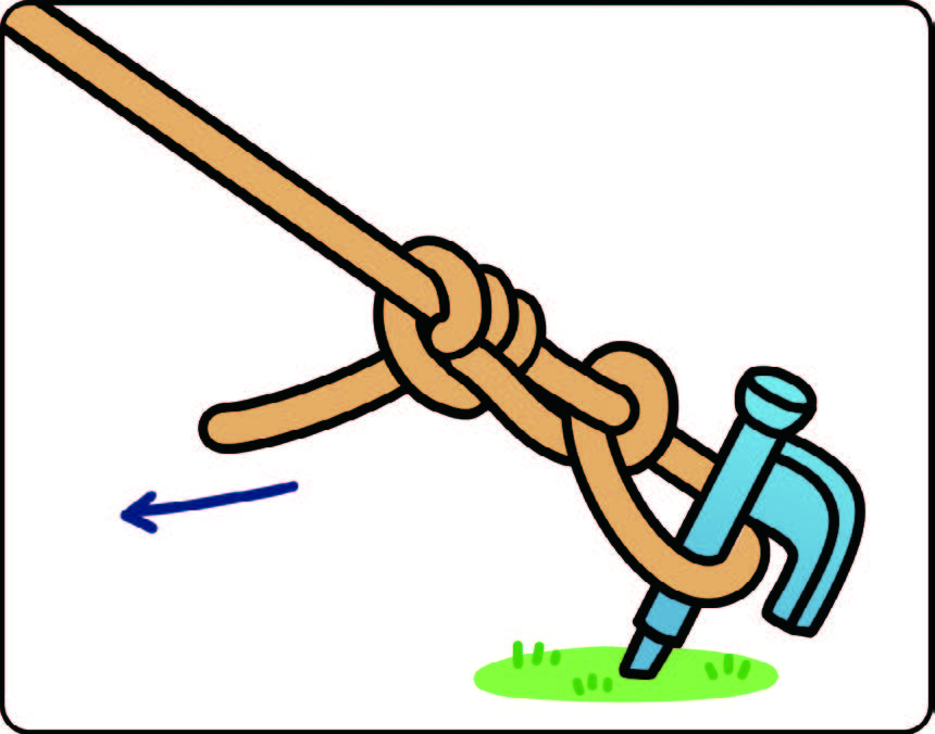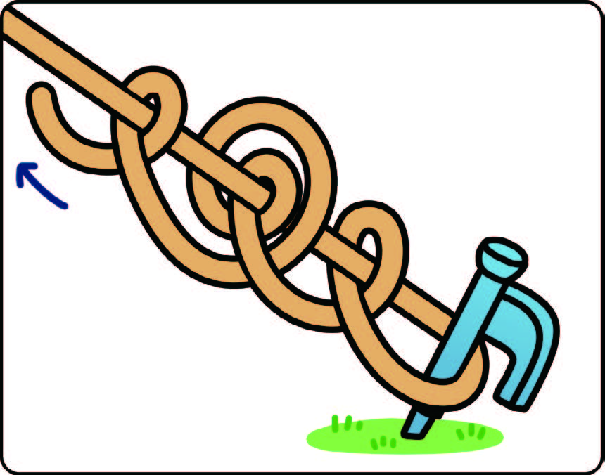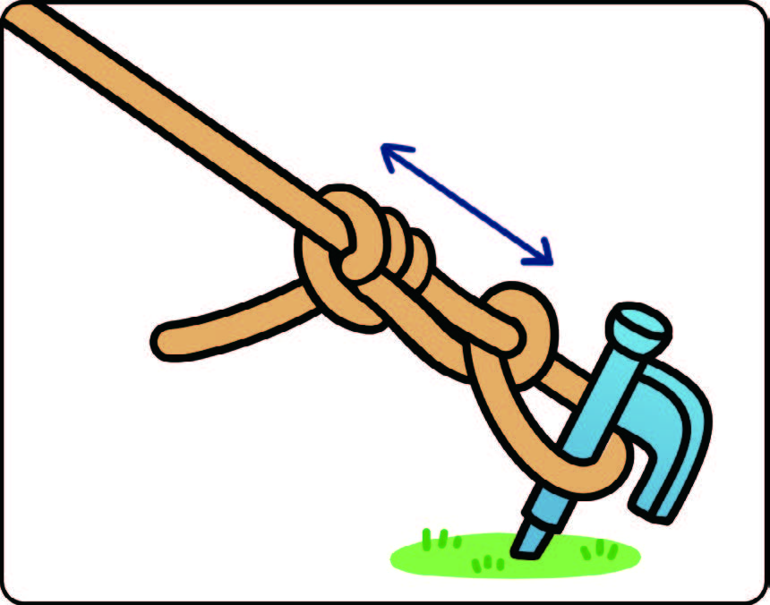 ガイラインに自在金具がない時のために知っておきたい便利な結び方。ロープの結び目をスライドさせて、テンションの強さを調整。