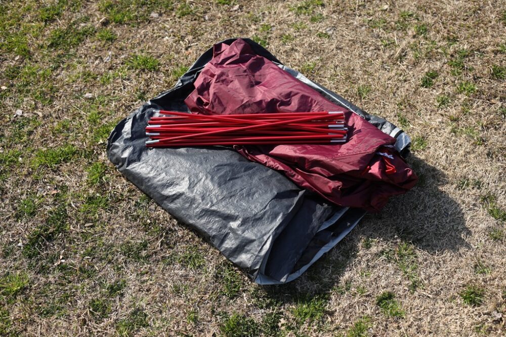 袋からフライシート、インナーテント、連結ポールなどを取り出し、準備をする。この時に部品が不足していると困るので、片付けの際はきちんとチェックしよう。