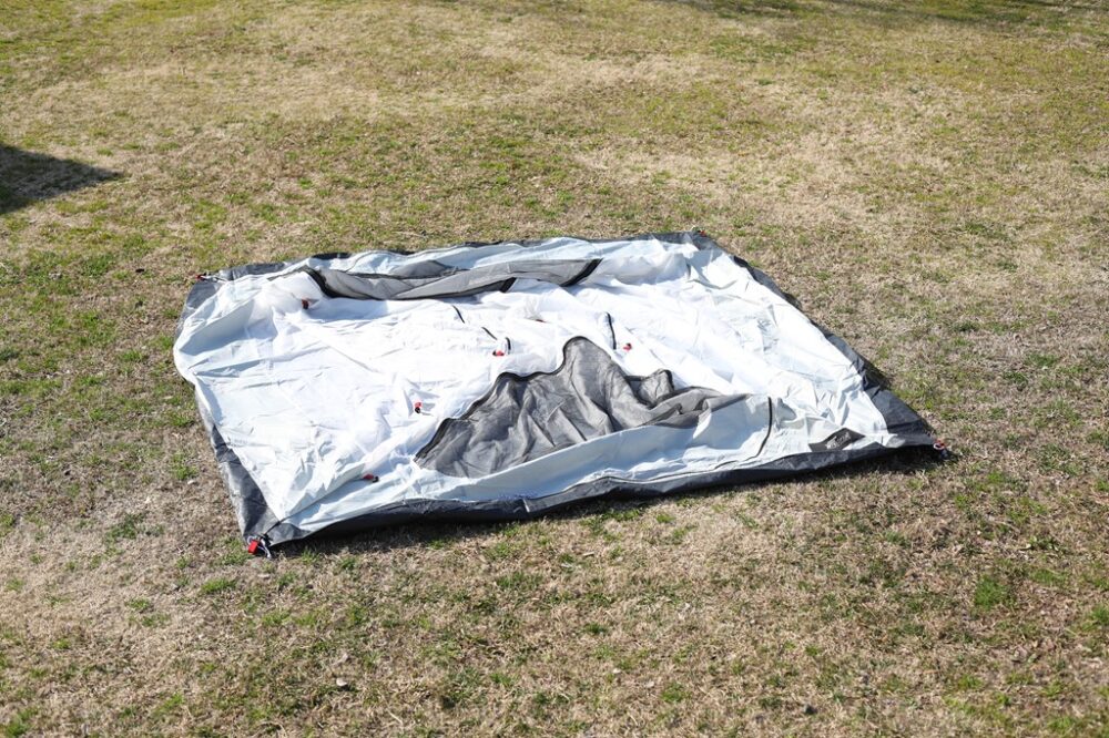 この時点ではテントを動かすことが可能なので、最終的な位置や出入口の方向を調整する。建てたインナーテントの上にフライシートを被せる。この時、インナーシートとフライシートにズレが生じないようにする。