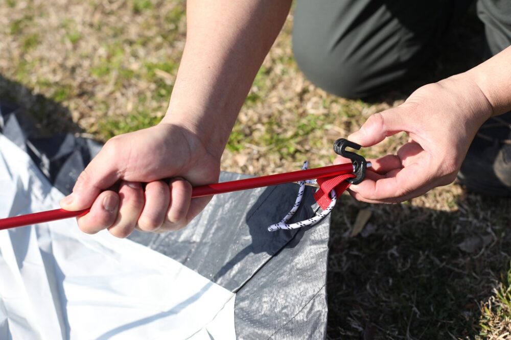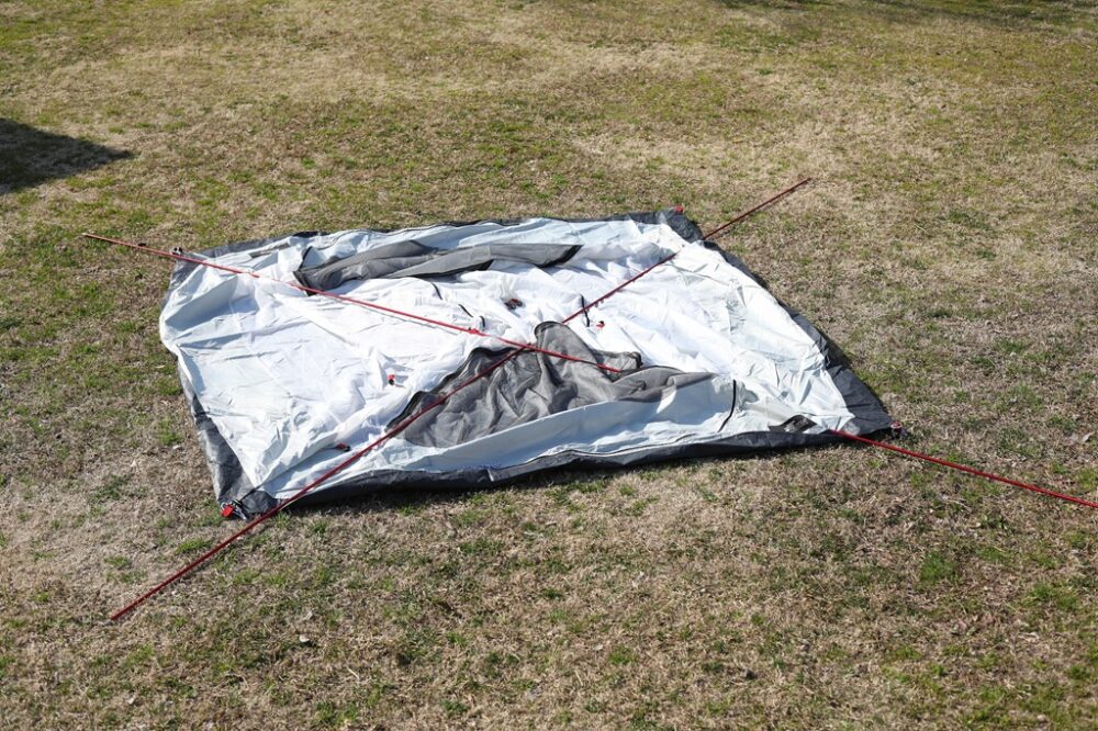 2本あるポールをそれぞれ連結し、テントの上に×になるような状態で置く。こうすることで、そのあとの作業を円滑に進められるようになる。