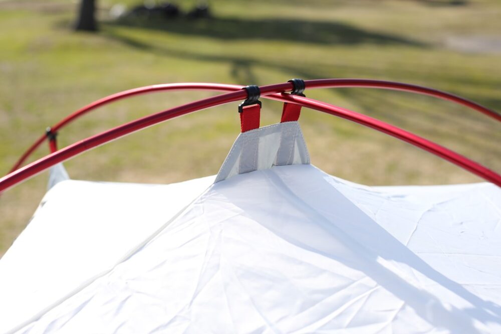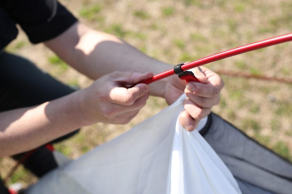 4で差し込んだ角と対称となる反対側も同様に、インナーテントに付いていた連結用の器具にポールに差し込み固定をする。ポールは意外としなるので注意しよう。