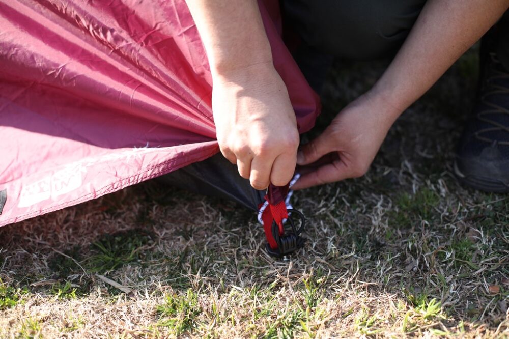 結露対策としてフライシートをピンと張りながら、インナーテントとの間に隙間を作るようにペグを打つ。フライシートの金具をポールにも引っかけて固定する。こうすることで、テントがより安定する。