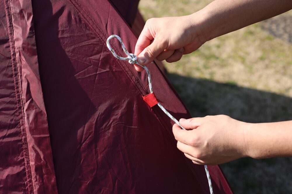 付属のガイラインをフライシートの中段にある外側の穴、センターループに通し、ペグで固定できるように地面まで引く。フライシートとインナーテントはくっつかないように。