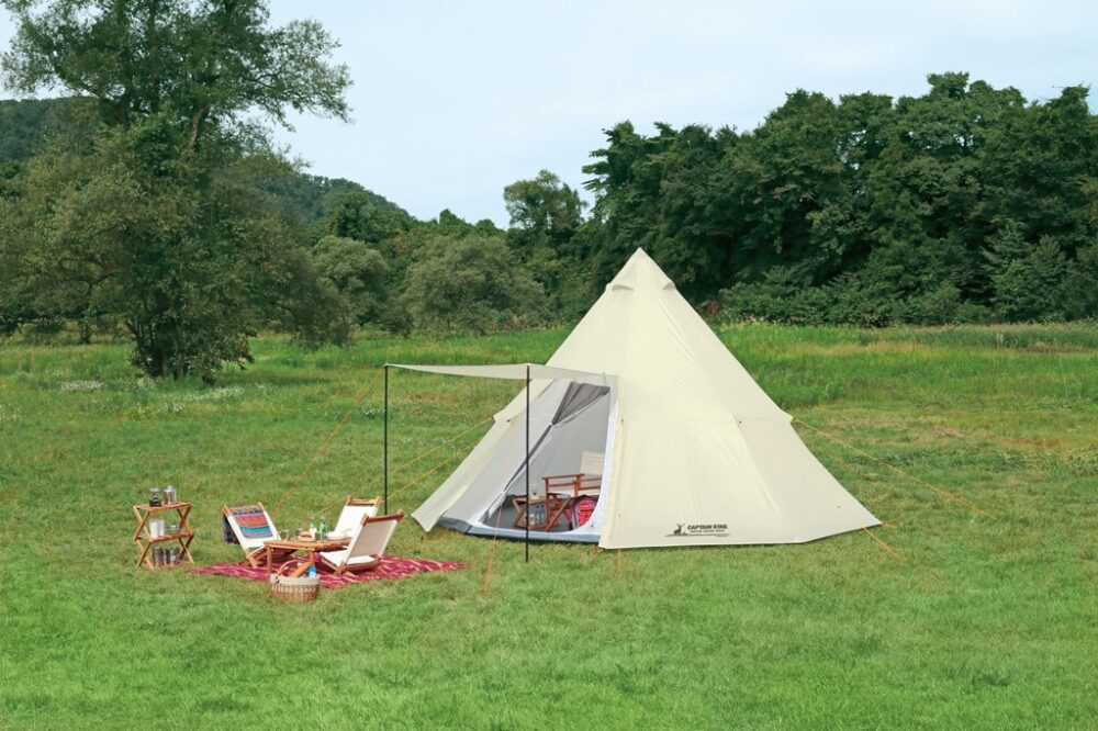 トンガリ屋根がビジュアル的にも楽しいワンポールテント。底辺をペグダウンしたらポールを1本立てるだけのシンプル構造なので、ビギナーにもお勧めのテントだ。