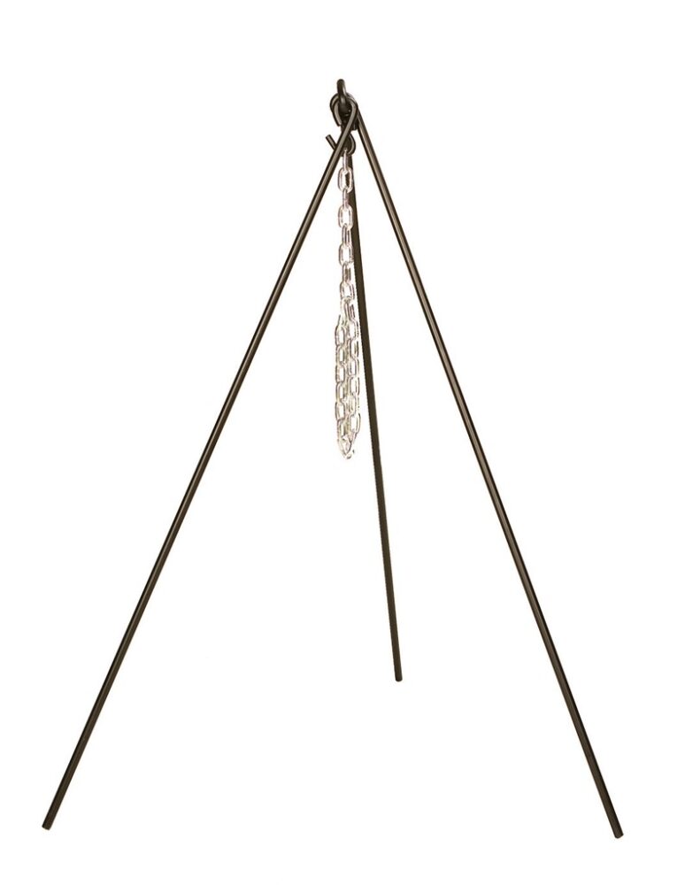 野外の調理器具としてよく利用されるのが、トライポッド(三脚)。これは、三脚の頂点のチェーンにダッチオーブンやケトルを焚き火の上に吊るして使う。火力の調整もしやすい。サイズ110cm 重量4kg 9240円