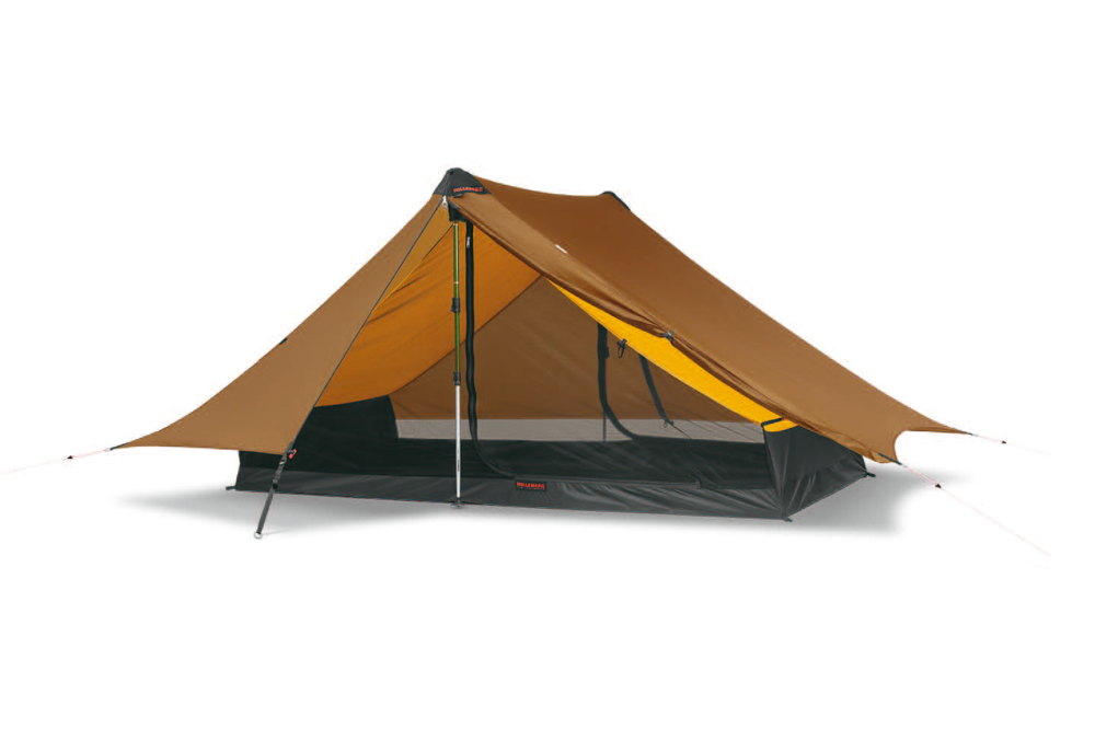 ヒルバーグが2020年4月に投入する新作のテントは、トレッキングポールで設営する2人用。アウターの生地は強度のあるケルロン1000を使用し、軽さと丈夫さを追求している。サイズ:全長220cm 高さ110cm 最小重量:1.2g(総重量1.4kg 収容人数:2名 9万9990円
