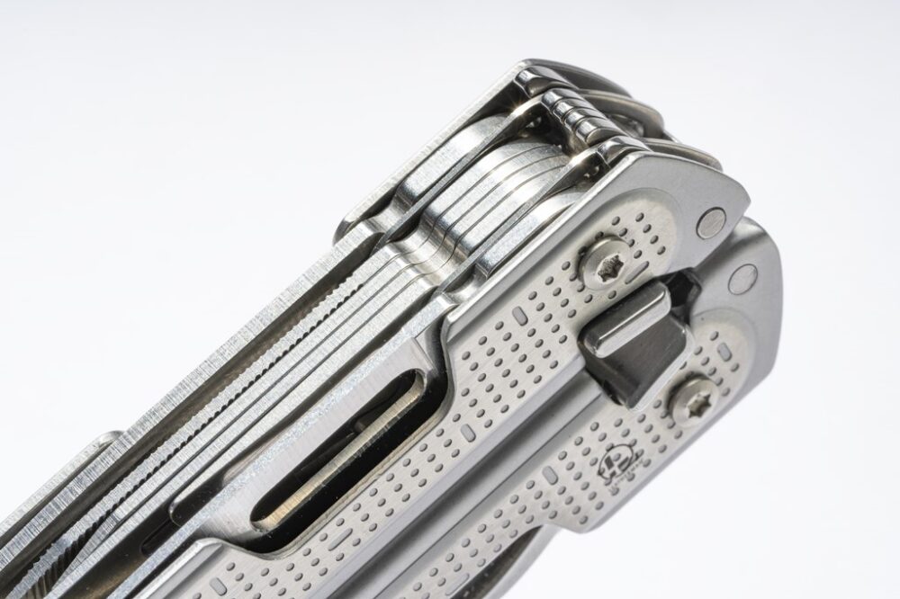 外側に配置された2枚のブレードとノコギリ、そしてハサミは片手でオープン&クローズが可能。そのほかのツールも同様に親指一本で取り出すことができるので、片手しか使えないシチュエーションでも使いたいツールに簡単にアクセスすることができる。