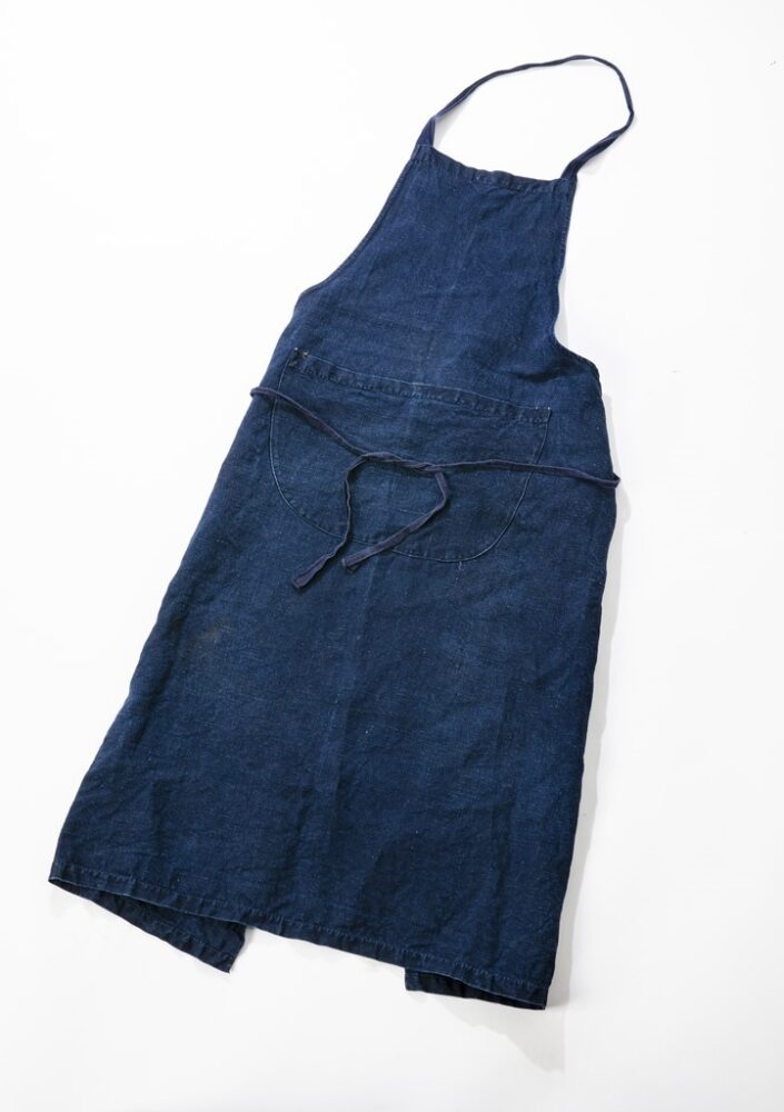 「町田の古着店、JAMにてデッドストックで購入したインディゴリネンのエプロンはキャンプはもちろん、自宅でも料理を作るときに愛用しています。ヴィンテージならではのエイジングがたまりません」