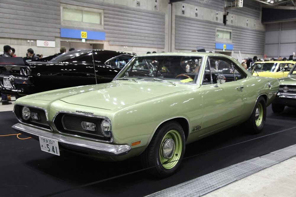 絶妙なメタリックグリーンの’69年式プリムス・バラクーダ。これくらい派手すぎないカラーリングで乗るのが大人のスタイル。