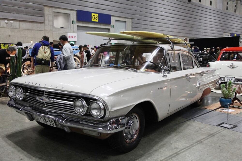 今回のライトニング・アワードに輝いたのは’60年式シボレー・ベルエア。選程良くやれた塗装とサーフボードを積んだディスプレイ、それに4ドアセダンという点。これぞカリフォルニアの空気感である。