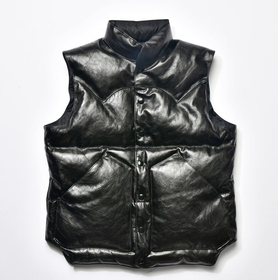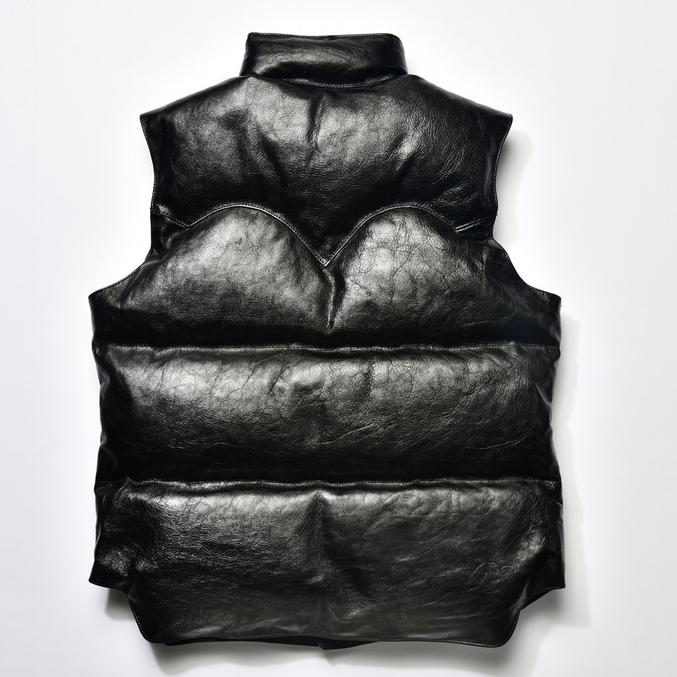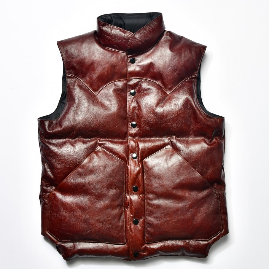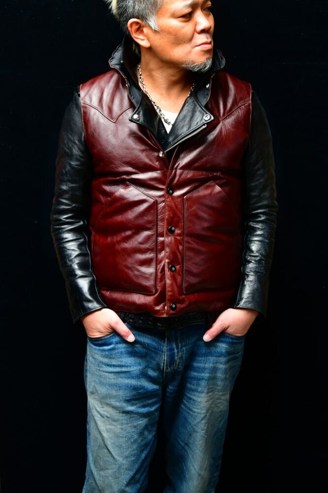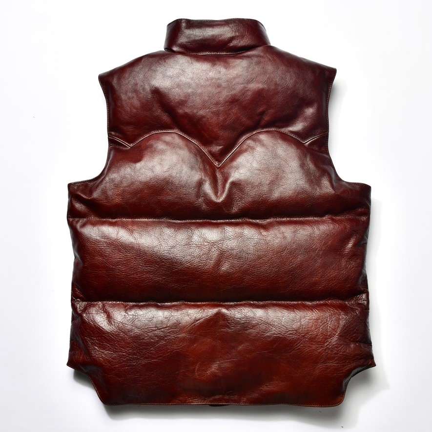 ヨーク部分とボディ部分の素材や色を変更しているレザーダウンベストが多い中、ヨーク部分とボディ部分、すべてを同色の馬革で作り上げた、“ありそうでなかった”レザーダウンベストがこちらの「イータ」。前頁のシータと同様の、1.5㎜厚のフルベジタブルタンニン鞣し・顔料仕上げの馬革だが、柔らかい個体を選別して使用している。ダウン90%・フェザー10%とダウン含有量も多く、730フィルパワーを発揮し保温性も非常に高い。14万3000円