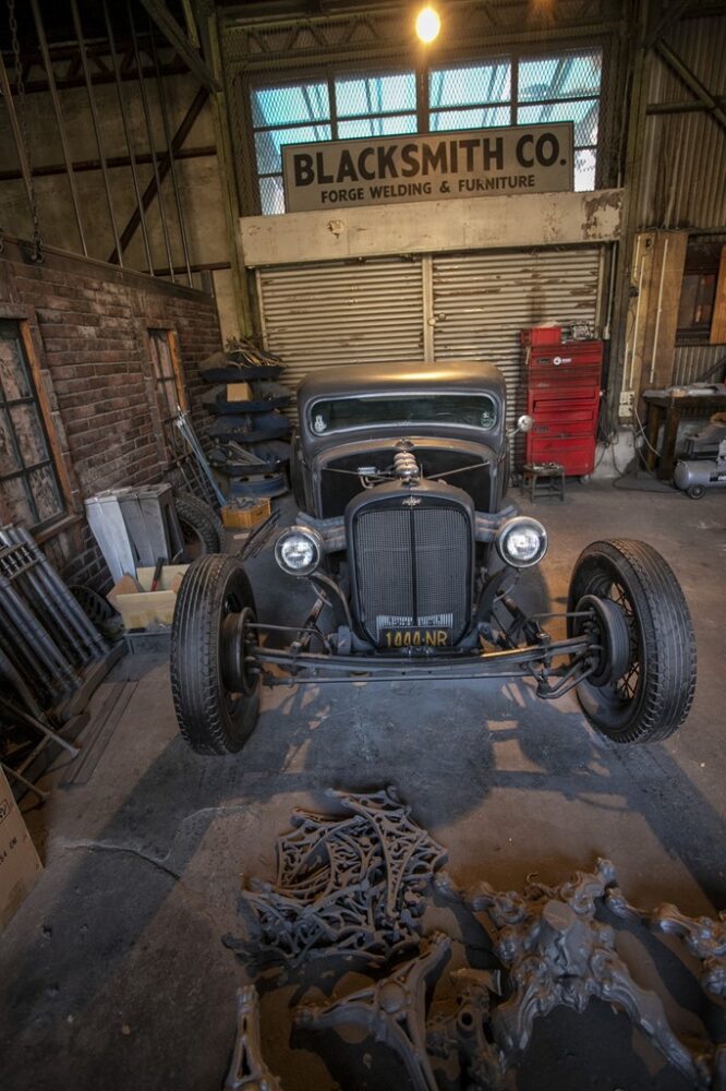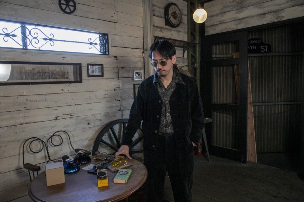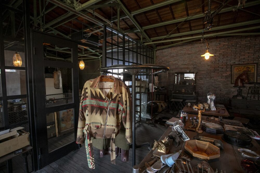 そうモノ作りの原点を話す滝川さん。彼のファクトリーにお邪魔すると、作業場横にはホットロッドが鎮座し内装もレンガの壁で映画のセットのような雰囲気。そして、ショールームにもなっている2階には作品に混じって数々のヴィンテージ品が並べられている。