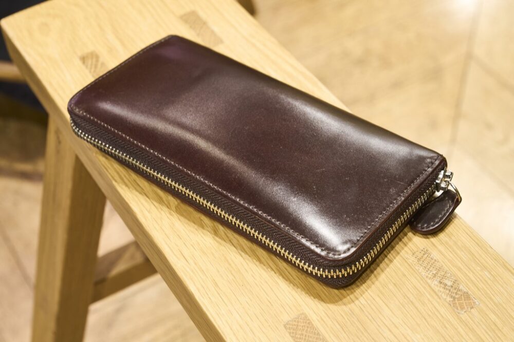 ガンゾのコードバンのウォレット。こちらは2代目で1年くらい愛用している。表面が衣類で磨かれてコードバンらしい美しい質感に経年変化しはじめた。