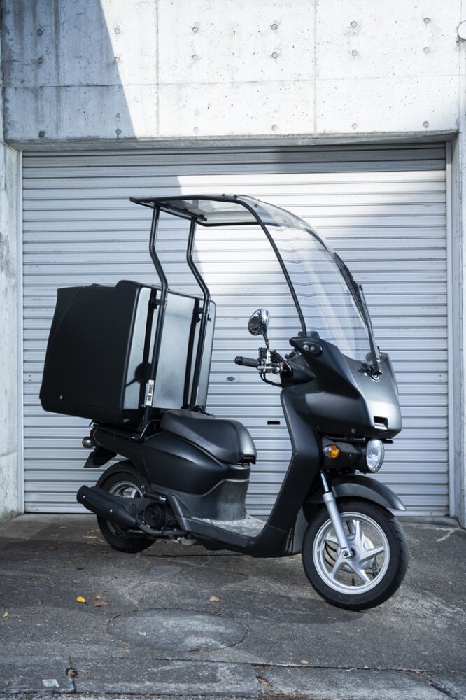 相棒はHONDA ベンリィ110にYAMAHAギアの屋根とボックスを装備し、マットブラックでペイントした都会的なフードデリバリー仕様。「ピザ店のデリバリーバイクを塗装したらイケてるのでは?」という着想からスピードの弱点を克服。