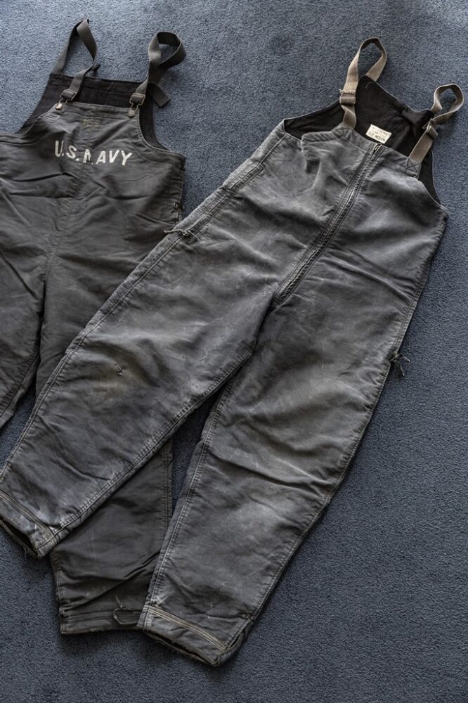 U.S.ネイビーのN-1デッキパンツはどちらも1940年代のもので右が前期、左が後期型。「いずれも冬のバイクライディング時に愛用しているアイテムです。めちゃくちゃ暖かくて重宝しています。ヴィンテージとはいえ、まだまだ値段も手頃なアイテムでオススメです」