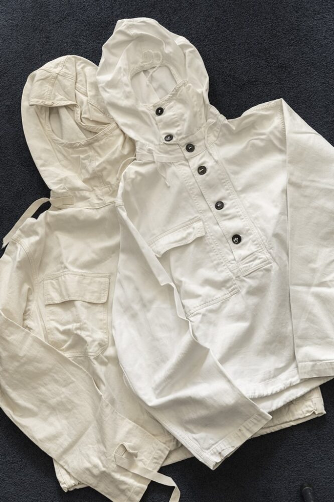 1940年代のU.S.ネイビーのスモックパーカ。フロントにボタンが付けられているタイプが前期型で、左が後期のもの。「近年、ヴィンテージ市場でも値段が上がりつつあるスモックパーカ。シャツやニットなどの上から、バックリと着ることができるので好きです」