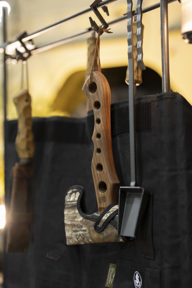 使用している斧は、バリスティックスのドリルドハンドアックス、ナタはネルデザインワークス、灰掻きはSomabitoのソマシャベルだ。