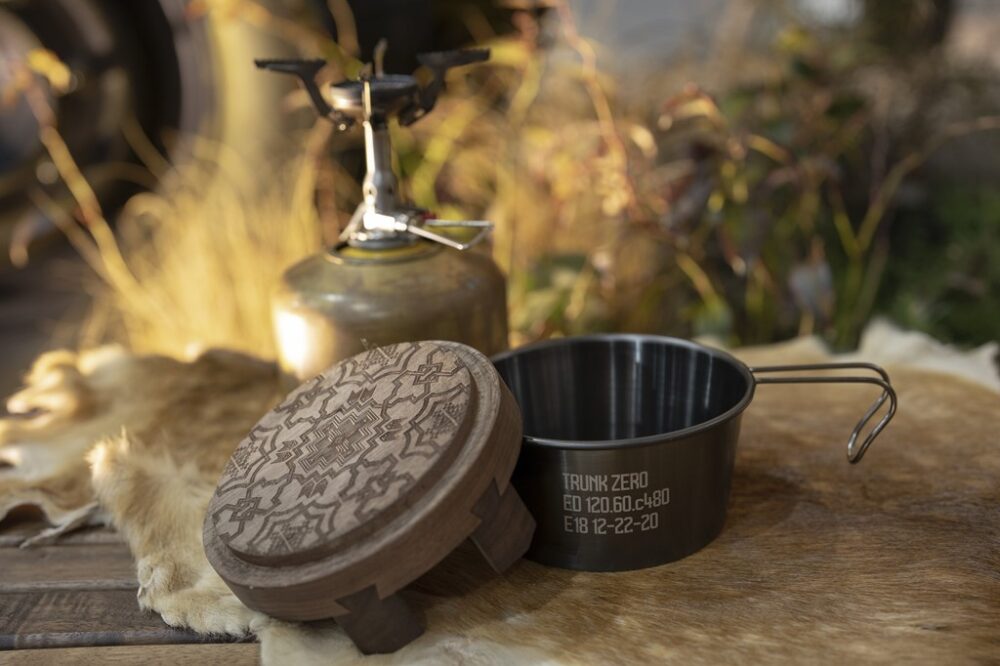 オールドマウンテンのOKAMADONに、ボンファイヤー×トランクゼロのシェラカップ。この2つでお米を簡単に炊けてしまうのだ。