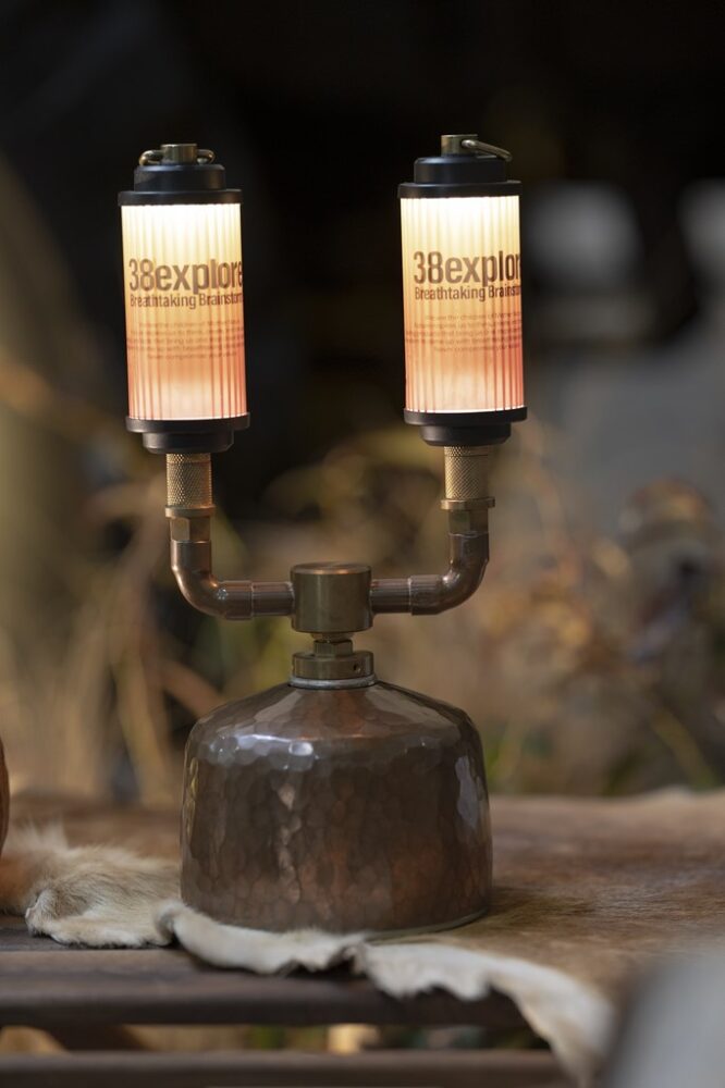 38エクスプローとオールドマウンテンのコラボとなる卓上ライト。クラシックなデザインながらもMAX200ルーメンのLED。台はネイタルデザインワークスのフタマタを使用。