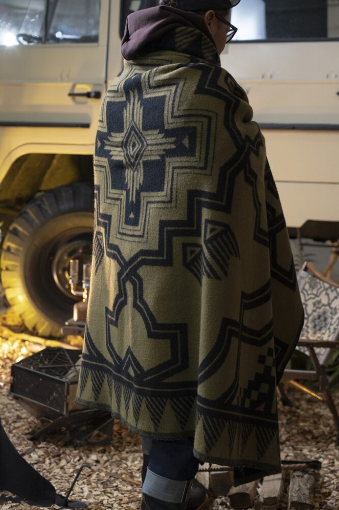 リアシートがフラットになるので、キャンプの際は車中泊をすることもある。内装とマッチしたブランケットはオールドマウンテン製。