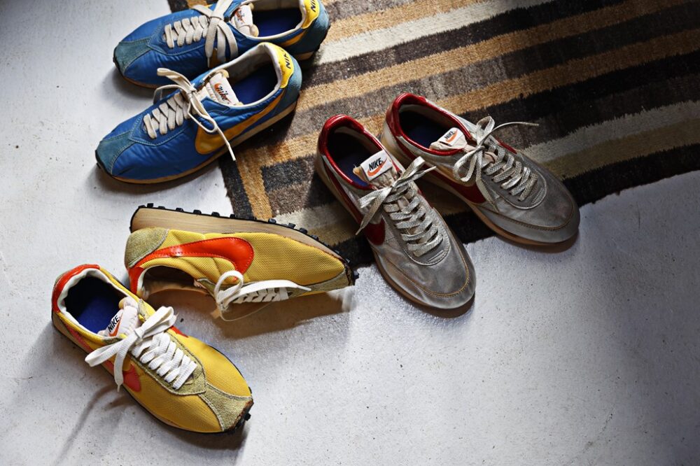 10代からずっと集め続けているのが、’70年代のナイキのランニングシューズ。基本的にデッドストックかミントコンディションのみを買っている。右から時計回りに珍モデルとしても有名なナイトトラック、王道のLD1000、カラーリングが気に入ったワッフルトレーナー。