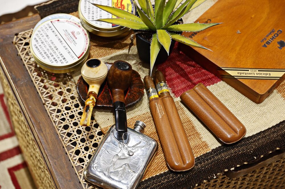 ここ最近、もっとも熱を入れているのが葉巻。40歳を機にタバコをやめて、葉巻を嗜むようになったそう。キューバ産しか吸わず、お気に入りはコヒーバとパルタガス。AEウィリアムスのスキットルとハンドメイドパイプのブライヤー、そしてメシャムも欠かせないアイテムとして挙げてくれた。