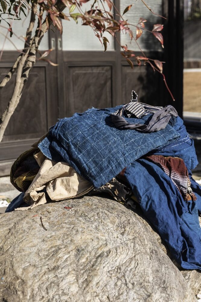 呉服店の蔵だったことから、リノベーションする際に整理をしていると多くの襤褸などが発掘されたそう。これはほんの一部で、日本らしい藍染の生地が多数あった。