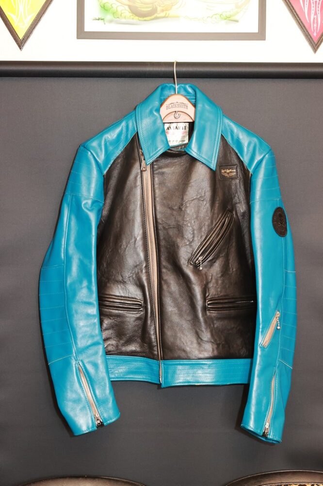 ルイスレザーで製作した限定13着のC×T×MオリジナルJKT。青と黒の配色がオシャレなターンダウンカラーのライダースで、左腕にはC×T×Mのロゴ入りパッチが施されている。