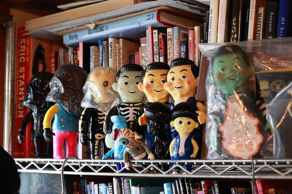 棚に並んでいるのは、MASATOさんと息子の稚乃くんをモデルにしたソフビ人形。世界中にファンがいるそう。