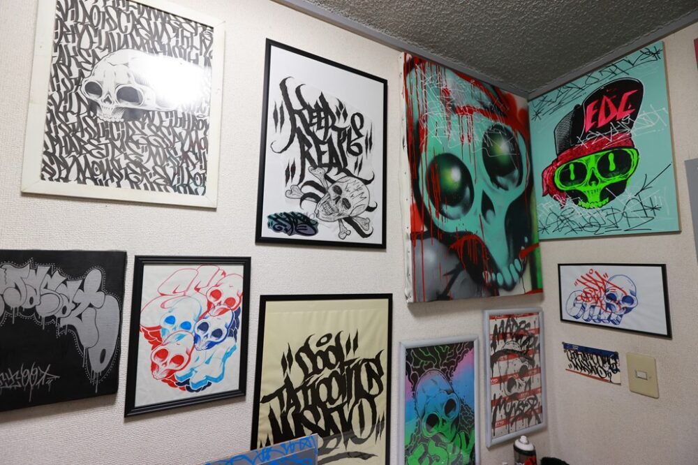 玄関を入ると、名古屋で活動するMASATOさんの友人、ESPY ONEさんが描いたスカルのアートピースが壁一面に飾られている。